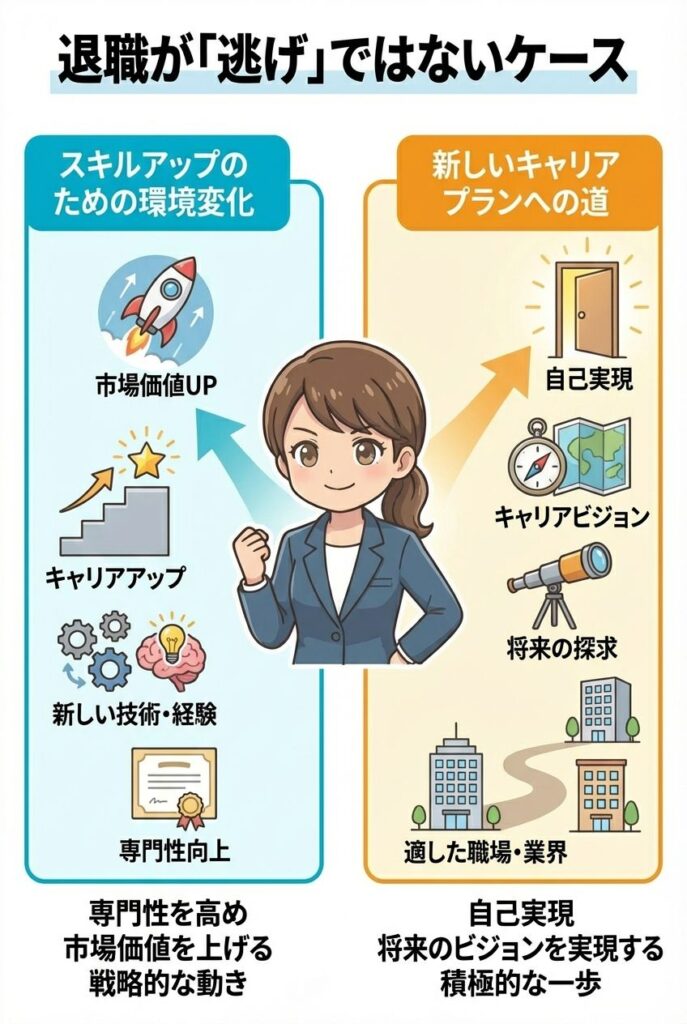 そもそも退職を「逃げ」と捉えるのは、少し短絡的で安易な考え方でしょう。実際には、退職は自己成長やキャリアアップのための積極的な選択であることが多いです。