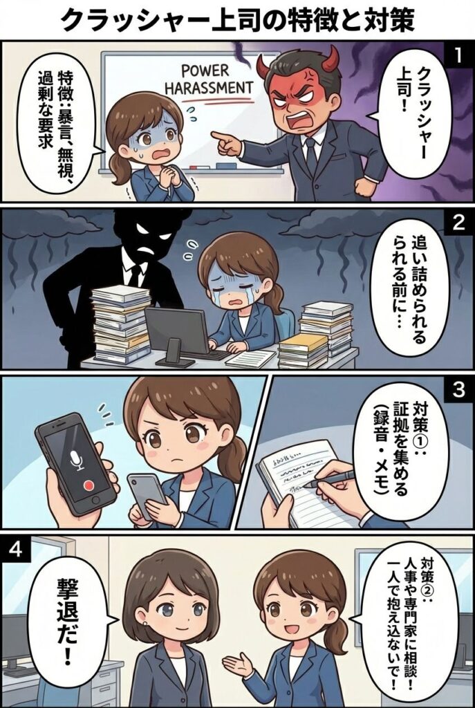 本記事では事例・体験談を入れつつ、クラッシャー上司の特徴と対策をまとめています。